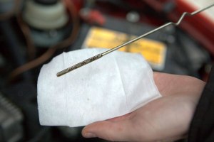3. Вытащите щуп из двигателя, протрите его сухой тряпкой или бумажным полотенцем, чтобы удалить остатки масла.