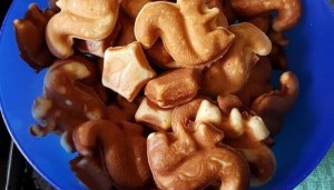 Теперь нам понадобится немного терпения. Берем каждый кружочек теста и с помощью ножа делаем разрез с двух сторон, делая две половинки, придавая форму ушек белочек. Можно использовать зубочистку, чтобы сделать отверстие для "глазок" белочек.