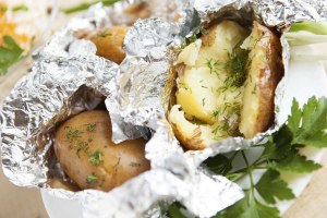 Отдельно возьмите еще один лист фольги и покройте им грибы таким образом, чтобы они полностью были покрыты. Закрутите фольгу со всех сторон, чтобы создать некое подобие закрытого пакета.