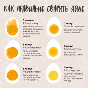 - Вареное яйцо с полужидким желтком и частично протертым белком: около 6-7 минут. Такое яйцо называется "среднее".