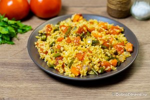 В это время можно приготовить булгур. Просто залейте его кипятком в пропорции 1:2 и дайте постоять 10-15 минут. Затем добавьте немного оливкового масла и перемешайте.