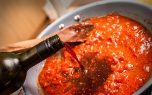 После этого добавьте в подливу немного белого вина. Выберите вино, которое хорошо сочетается с рыбой, например, сухое белое вино. Вино придаст блюду аромат и утонченность. Продолжайте готовить на среднем огне еще около 10-15 минут, чтобы алкоголь испарился, а подлива приобрела богатый вкус.