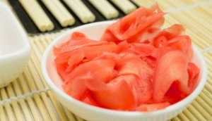 Имбирь - это тонко нарезанный корень имбиря, который обычно подается рядом с суши и роллами в качестве дополнения или акомпанемента. Он имеет красный оттенок и остро-пикантный вкус, который помогает освежить вкусовые рецепторы между разными кусочками суши и роллами.