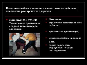 Нанесение побоев представляет собой преступление и рассматривается в соответствии с уголовным законодательством. Размер наказания зависит от тяжести причиненных телесных повреждений, наличия обстоятельств, утяжняющих вину и других факторов. Возможные наказания могут включать штраф, исправительные работы, ограничение свободы или лишение свободы.