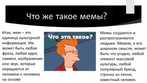 Мемы - это часто вирусные изображения, видео, фразы или концепции, которые распространяются быстро в интернете, особенно через социальные медиа. Они могут появляться и исчезать с течением времени, и их значимость зависит от популярности и понимания пользователей интернета.
