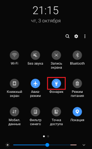 2. В верхней части Панели быстрых настроек найдите иконку фонарика (обычно это маленькая лампочка) и нажмите на нее.