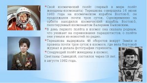 Ее полет историческим событием, так как она стала первым женщиной, покорившей космос. Валентина Терешкова провела в космосе почти три дня, совершив 48 витков вокруг земли. Во время полета она выполняла различные научные и медицинские эксперименты, которые помогли расширить наши знания о влиянии космической среды на организм человека.
