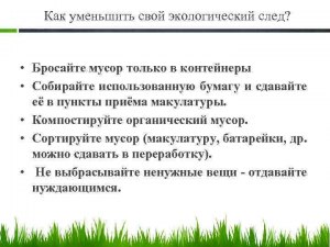 Один из способов уменьшения экологического следа – это рациональное использование ресурсов. Мы можем контролировать свое потребление энергии и воды, экономить на использовании упаковки, покупать продукты, произведенные более экологичным способом. К примеру, использование энергосберегающей техники, раздельный сбор мусора, снижение потребления пластиковых изделий, использование общественного транспорта или велосипеда.