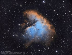 Туманность "Пакман" также славится своей богатой цветовой схемой. Небольшие изменения в плотности и составе газа в туманности приводят к изменению цвета рассеяного света. Поэтому на фотографиях она может выглядеть в разных оттенках - от ярко-красного до голубого.