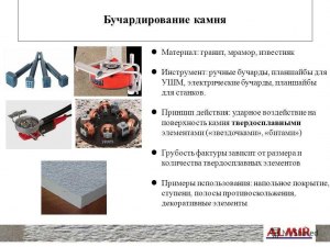 Процесс бучардирования применяется для придания декоративного или функционального свойства обрабатываемым материалам. Бучардирование может создавать различные текстуры и узоры на поверхности, которые могут быть как глубокими и рельефными, так и более мелкими и гладкими. Эта техника позволяет достичь эффекта "старины" или "естественного износа" на материале.