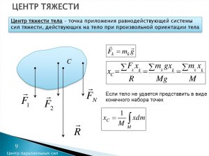 Положение центра тяжести (x) системы можно выразить суммой произведений масс на координаты их центров масс, деленной на сумму масс:
