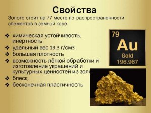 Золото имеет плохую растворимость в обычных химических реагентах, однако растворяется в растворах цианида, что используется в процессе извлечения золота из руды. Наряду с высокой декоративностью и ценностью для ювелирных изделий, золото также широко используется в инвестиционных целях, так как является стабильным средством сохранения капитала.