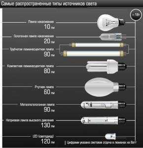 Какие существуют виды ламп (источников света), какой у них КПД?
