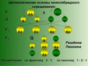 Теперь рассмотрим часть гибридов от скрещивания Аа х АА, которая является гомозиготной по рецессивному признаку: