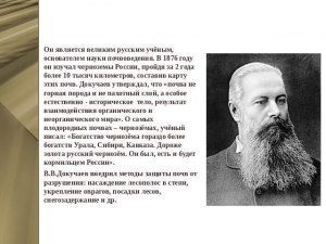 - Василий Васильевич Докучаев (1846–1903) родился в семье крестьянина и с ранних лет проявлял интерес к природе. Он обучался в Санкт-Петербургском университете, где начал формировать свои идеи о почвах.