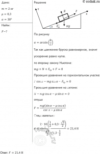 3. **Сила трения (Fт)**: Сила трения, тогда как брусок скользит, определяется по формуле \( F_t = \mu \cdot N \), где \( \mu = 0,4 \) — коэффициент трения. Подставляем выражение для N: \( F_t = \mu \cdot m \cdot \frac{g}{\sqrt{2}} \).