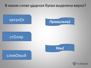 - Правильные выделения ударных гласных звуков в словах под номерами: 1, 2, 4, 5.