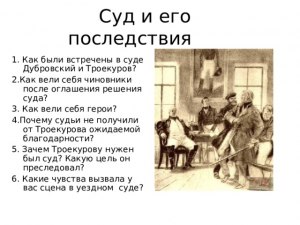 - Призыв к справедливости: Дубровский обращается к Троекурову с призывом к справедливости, подчеркивая свою правоту. Это создаёт момент эмоционального напряжения, который усиливает драматизм события.