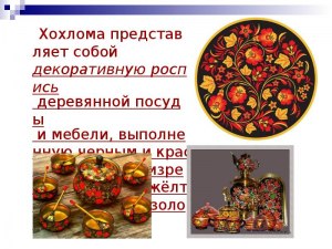 Словом «хохлома» называют декоративную роспись деревянной мебели или посуды золотистыми, зелёными и красными красками на чёрном фоне. Существует два основных типа росписи: «верховая» роспись, когда расписывают красным и чёрным на золотистом фоне, и роспись «под фон», когда на цветной фон наносят золотые узоры. Конечно, мастера не используют в работе настоящее золото, но изделие всё равно выглядит очень красивым.