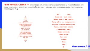 Фигурные стихи – это произведения, в которых форма имеет значение не меньше, чем содержание. Строки и слова расположены таким образом, чтобы создавать различные визуальные образы, иногда напоминающие рисунок или фигуру.