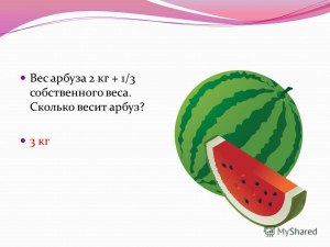 Ответы на вопрос » образование » Арбуз весит 3 килограмма плюс пол арбуза. Сколько весит арбуз?