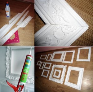 6. После того как углы корректно соединены, можно приступить к креплению рамки на стену. Используйте клей или шурупы для надежной фиксации плинтусов.