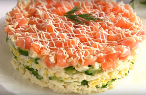 Какие ингредиенты положить в слоеный салат из красной рыбы?